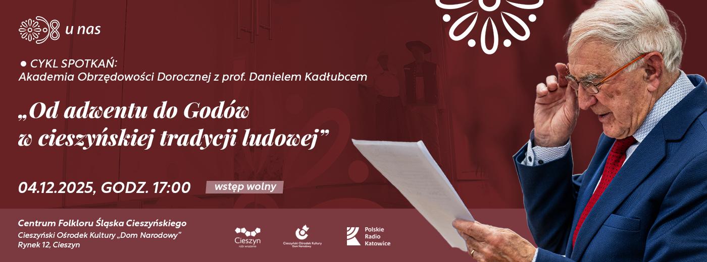 Cieszyński Ośrodek Kultury "Dom Narodowy" zaprasza na kolejne spotkanie z wybitnym znawcą kultury, tradycji i języka Śląska Cieszyńskiego, profesorem Danielem Kadłubcem. Wydarzenia z cyklu "Akademia Obrzędowości Dorocznej" organizowane są ramach działalności Centrum Folkloru Śląska Cieszyńskiego! Na spotkanie pt. "Od adwentu do Godów w cieszyńskiej tradycji ludowej" zapraszamy w czwartek 4 grudnia 2025 na godzinę 17:00 do Domu Narodowego. Wstęp wolny!