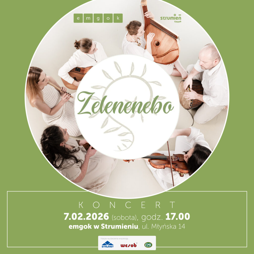 Miejsko-Gminny Ośrodek Kultury w Strumieniu (emgok) zaprasza na koncert ukraińsko-polskiego ZELENENEBO. To ukraińsko-polska grupa, tworząca muzykę na wielu klasycznych i ludowych instrumentach, zachwycająca dwu i trzygłosowym śpiewem.